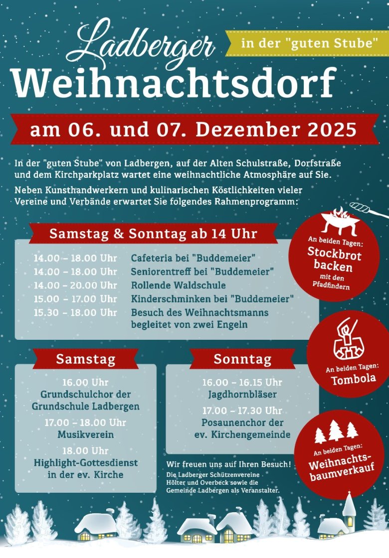Der Duft von Plätzchen, frischen Waffeln, Crêpes, Glühwein und Feuerzangenbowle zieht dann wieder durch die „gute Stube“ von Ladbergen (Alte Schulstraße, Dorfstraße und Kirchparkplatz) und lädt Groß und Klein zum Verweilen ein.